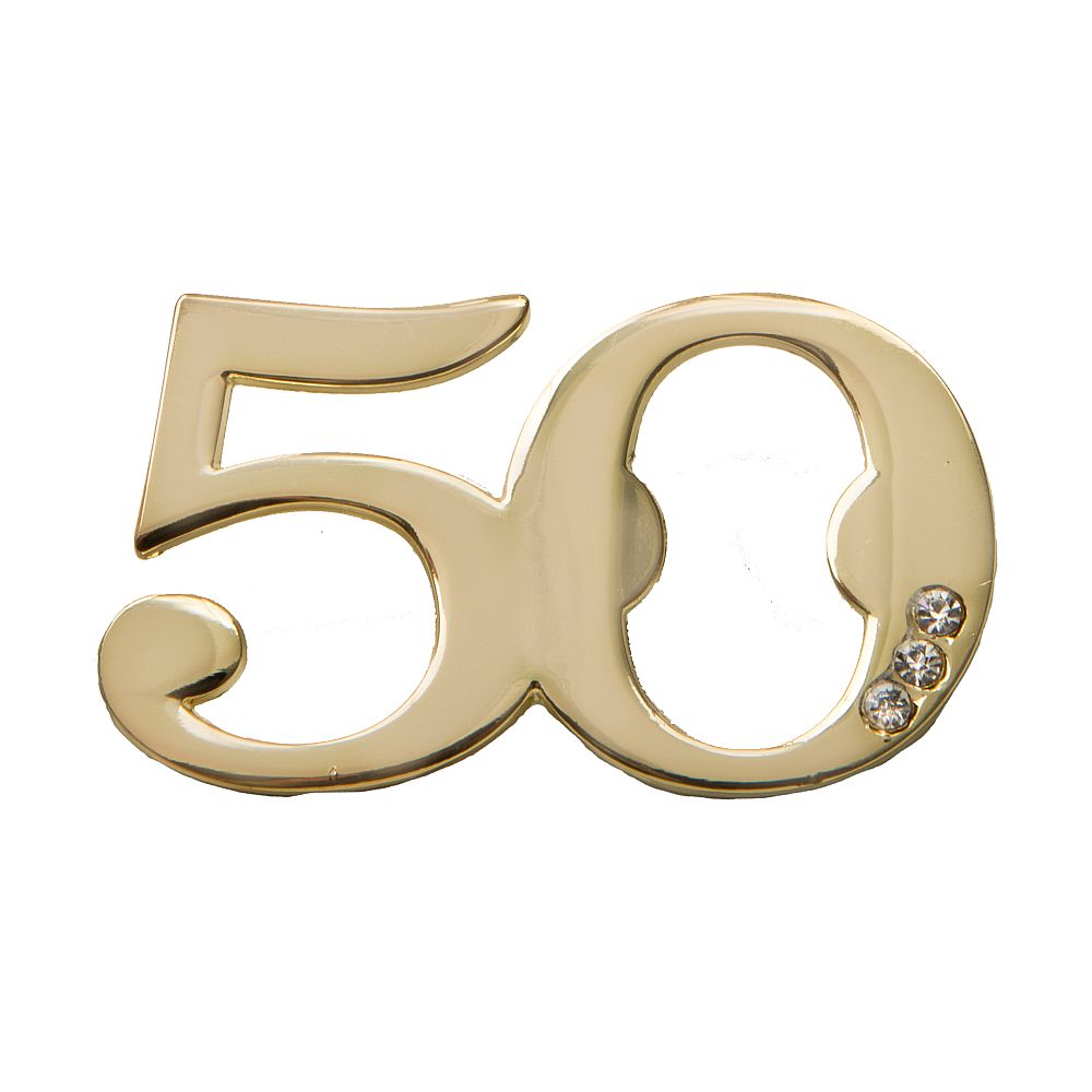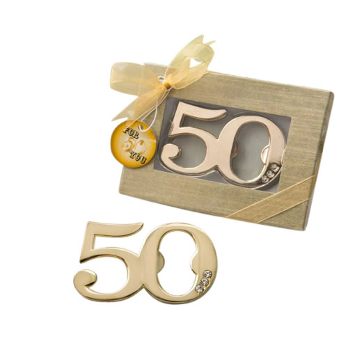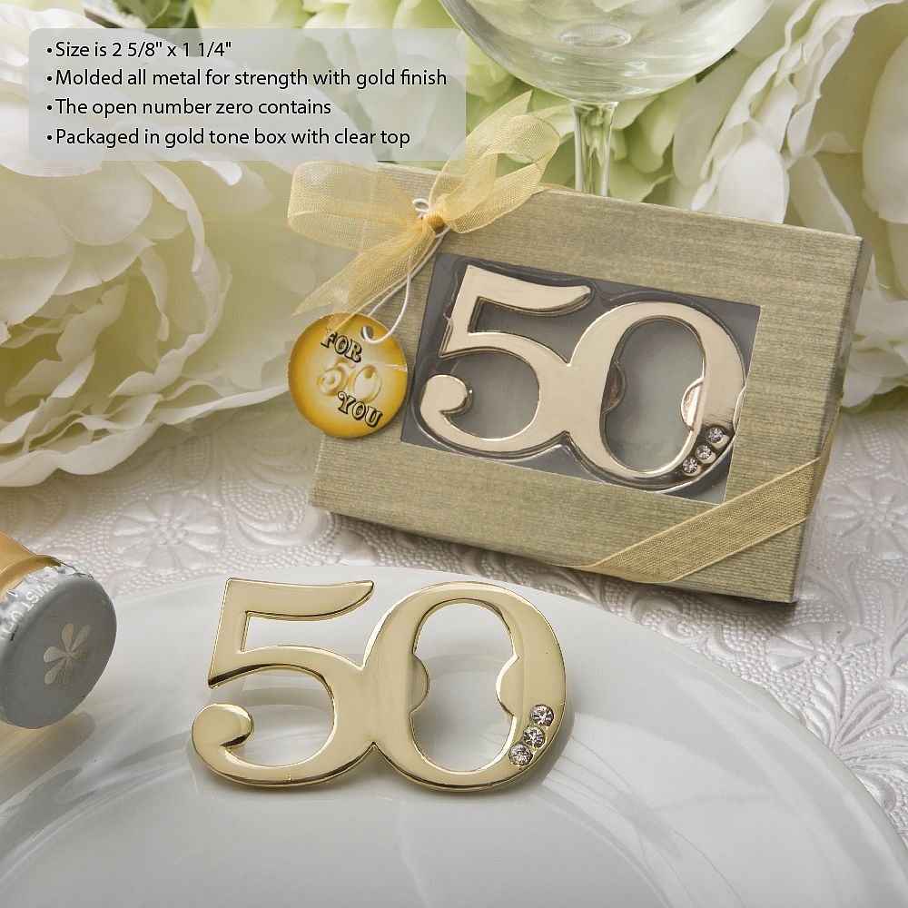 The numbers are molded from all metal in the shape of a large 50 with a golden finish. Three sparkling rhinestones add a special touch to the classic design. The open number zero doubles up as a strong bottle opener.