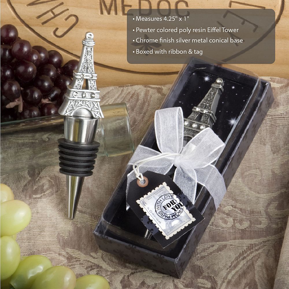 These From Paris with Love Collection Eiffel Tower wine bottle stopper favors are truly tres chic