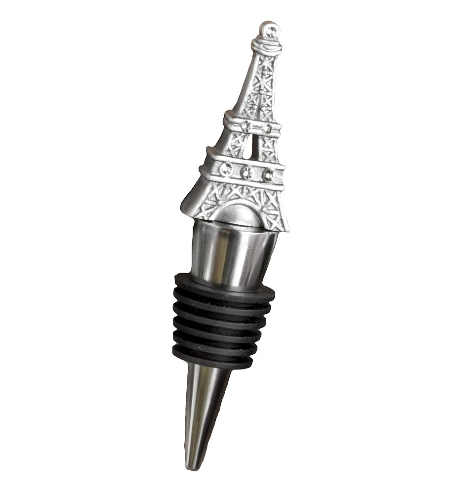 One of the most recognizable landmarks from one of the world’s most romantic cities, the Eiffel Tower is an enchanting symbol of love. And these elegant wine bottle stoppers, part of Fashioncraft®’s exclusive From Paris with Love Collection of French inspired favors, capture the tower’s timeless charm! Each wine bottle stopper favor measures 4.25″ x 1″ and features a detailed pewter colored poly resin Eiffel Tower replica, enhanced with glistening rhinestones, atop a chrome finish silver metal conical base, wrapped with a black rubber gasket for a snug seal. Each comes resting against a starry night design insert background in a clear topped box with a black fleur de lis design charcoal grey base. The box is wrapped with a white organza ribbon and an attached Eiffel Tower postage stamp design “For You” tag.