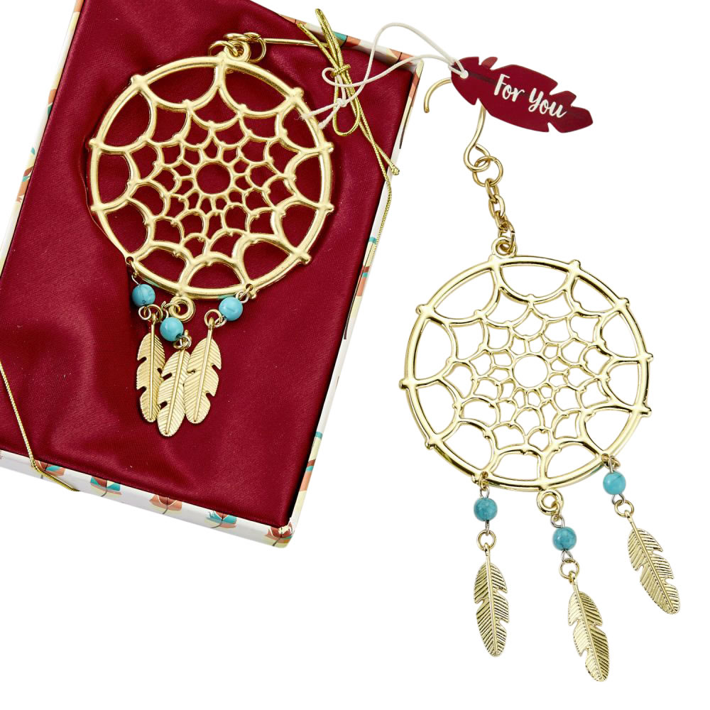This Dream Catcher ornament is made of sturdy metal with a gold finish. It has a detailed design with three attached molded metal feathers. Each feather has a beautiful turquoise bead accent.