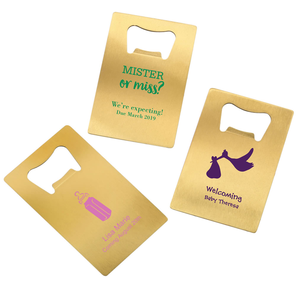 Offer your guests a fun and practical gift that is always associated with good times! These brushed gold Stainless Steel bottle openers can be personalized with your unique message.