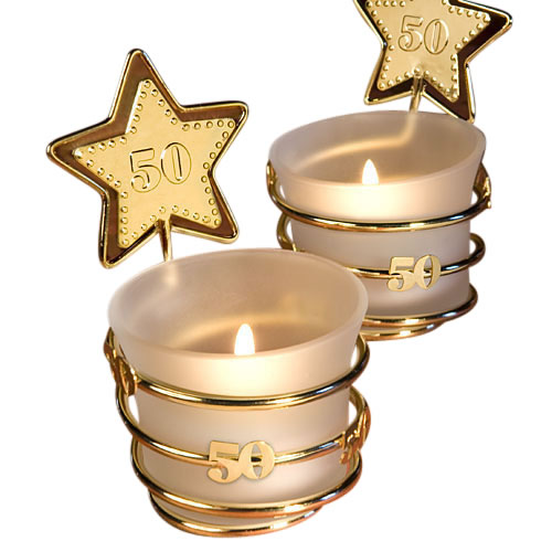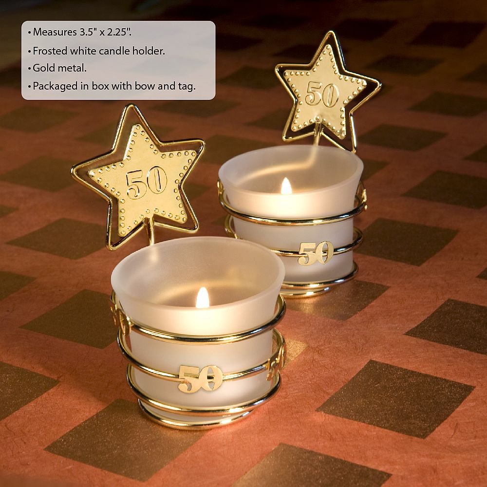 You’re celebrating a great couple that’s been together through thick and thin for fifty years! Perhaps you need the perfect favor for that special 50th birthday. So give them and your guests the star treatment with these glitzy golden anniversary keepsakes. Sold only by Fashioncraft®, each Fabulous Fifty favor measures 3.5″ x 2.25″ and has a frosted white glass candle holder with a white tea light candle inside resting in a gold metal coiled wire base. The base’s coil wraps around the holder with “50” enhancements and rises up to form a star shape with a beaded star design “50” charm at its center. Sure to leave your guests starry eyed, each comes individually packaged in a white box.