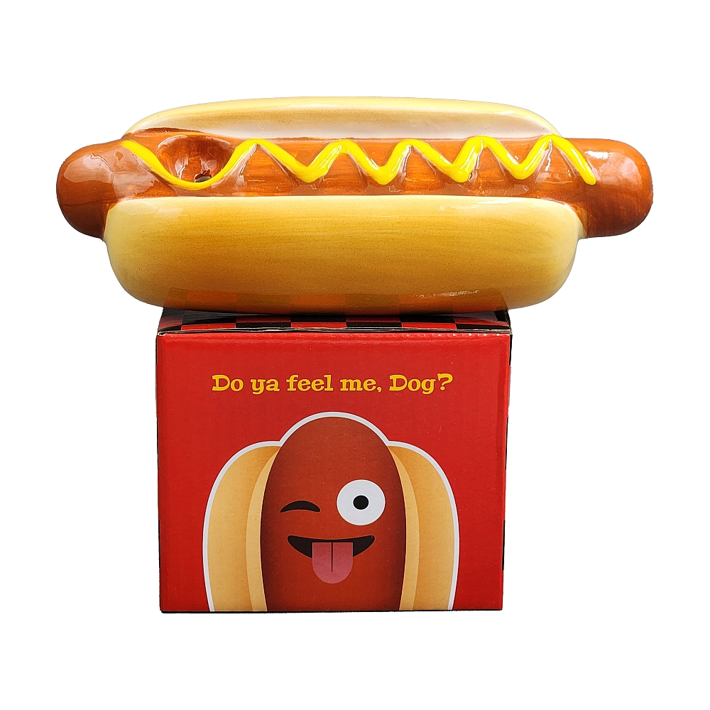 The real-looking novelty adult Hot Dog pipe has a fun 3D-feel. It is made of ceramic and features a bun with a hot dog inside and topped with a squiggly line of mustard. Delicious!